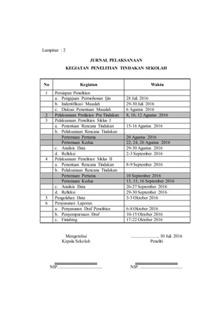 Surat izin penelitian tindakan sekolah ini memberikan persetujuan untuk penelitian tentang peningkatan kemampuan guru dalam pengelolaan KBM melalui supervisi akademik. Penelitian ini akan dilaksanakan selama semester 1 tahun pelajaran 2016/2017 di SDN dengan berbagai jadwal kegiatan yang terperinci. Berbagai lampiran disediakan untuk mendukung pelaksanaan dan dokumentasi penelitian.