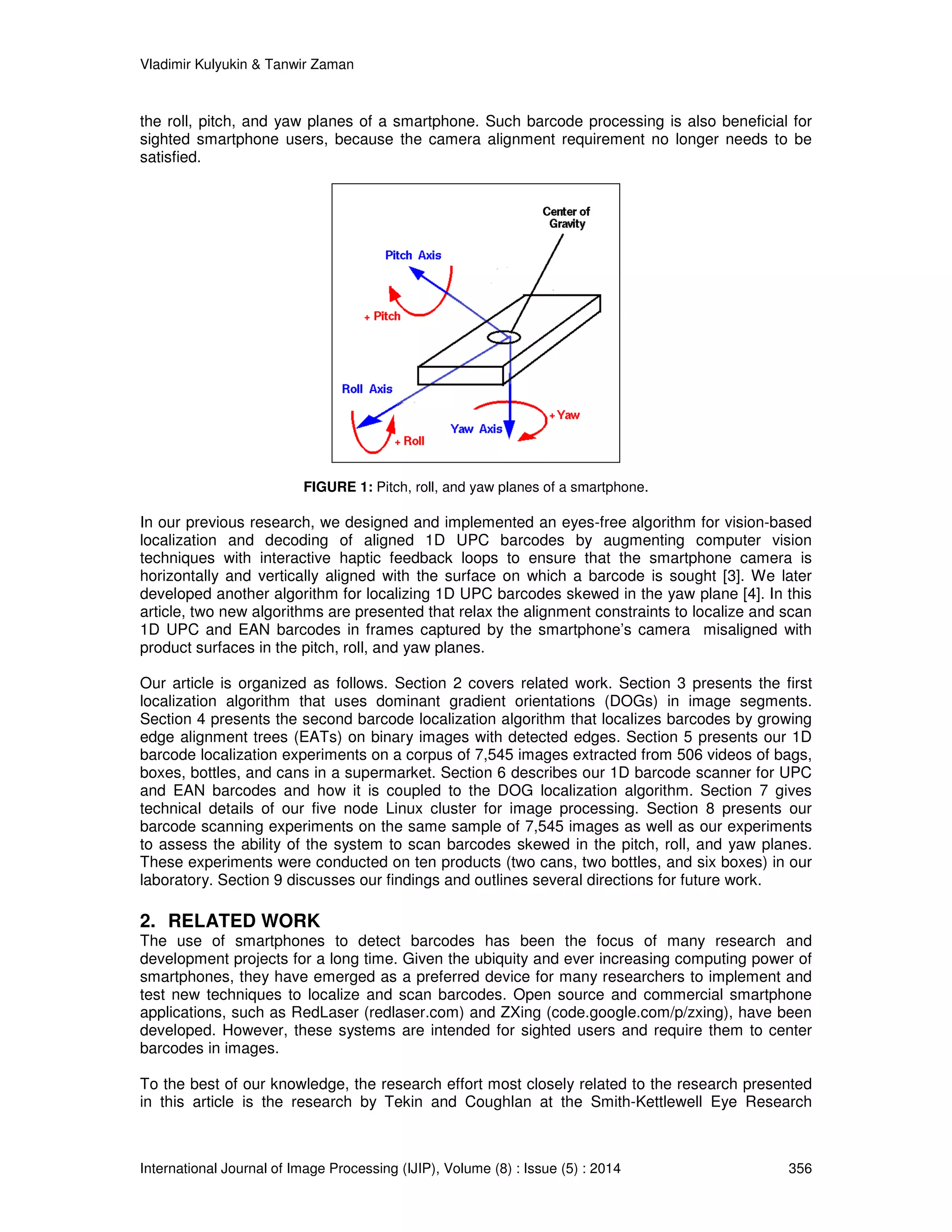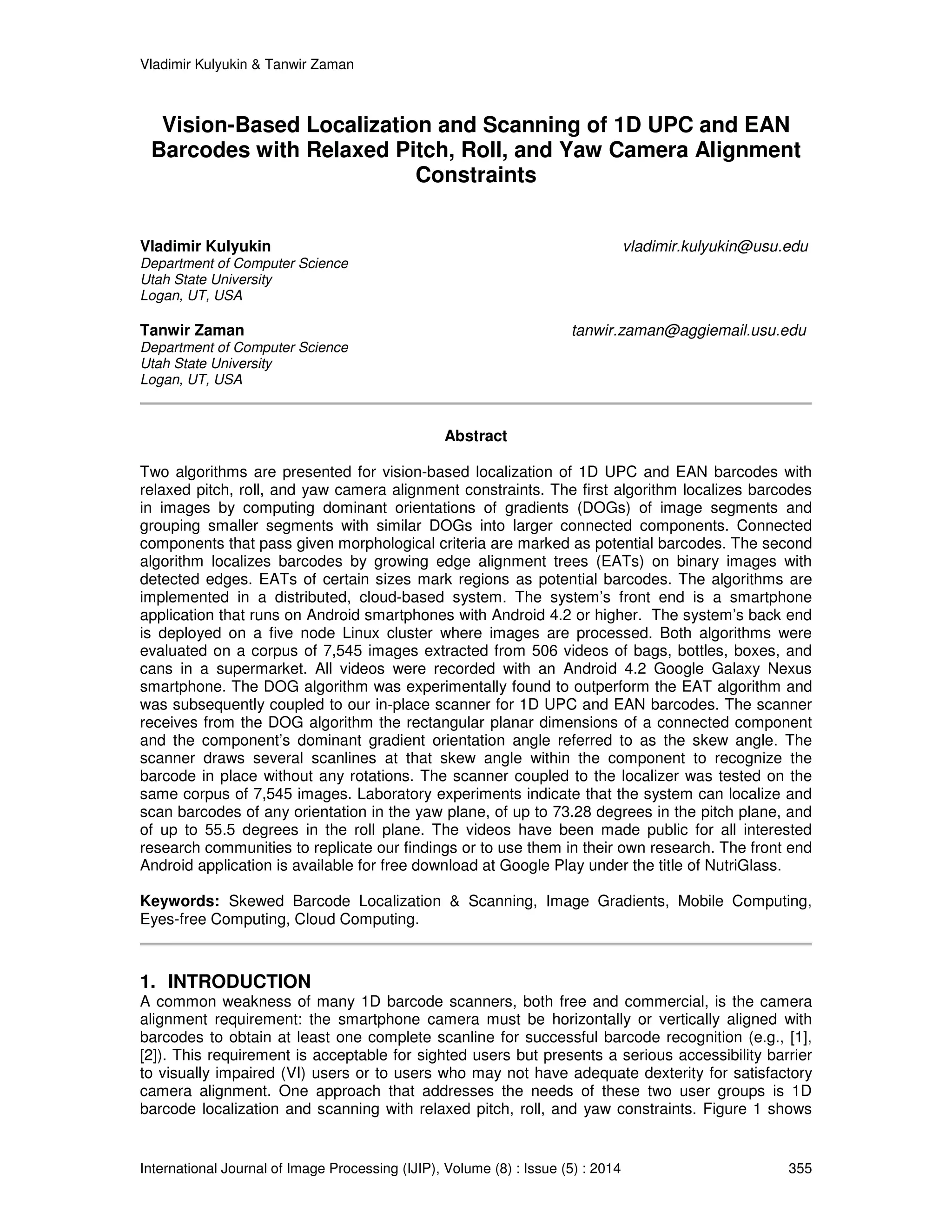 The document presents two algorithms for vision-based localization and scanning of 1D UPC and EAN barcodes with relaxed camera alignment constraints, improving accessibility for visually impaired users. The first algorithm uses dominant orientations of gradients (DOGs) in image segments, while the second utilizes growing edge alignment trees (EATs) on binary images. A cloud-based system and a smartphone app named Nutriglass implement these algorithms, which were evaluated on a large dataset of images from supermarket products, showing effectiveness in scanning barcodes at various orientations.