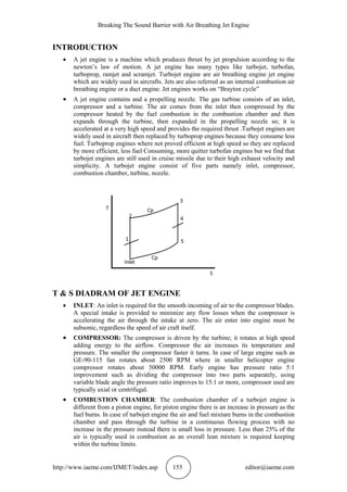 The document discusses air breathing jet engines and breaking the sound barrier. It provides details on the components and working of jet engines, including the inlet, compressor, combustion chamber, turbine, and nozzle. It also discusses jet engine performance factors like thrust. The key objectives are to increase jet engine performance/efficiency and study the materials used to withstand high temperatures and pressures. Hypersonic speed above Mach 5 is seen as important for the 6th generation of fighter aircraft using scramjet engines.