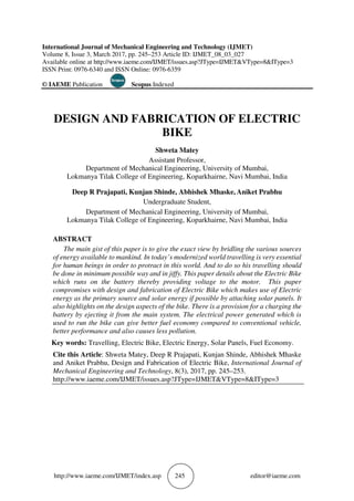 The document describes the design and fabrication of an electric bike. It discusses the components of the electric bike, which include a DC motor, frame, platform, battery, chain drive, braking system, and sprockets. The electric bike is powered by a battery that provides voltage to the motor. It can provide better fuel economy and less pollution than conventional vehicles. The design aims to use electric energy as the primary power source and possibly supplement it with solar energy through attached solar panels.