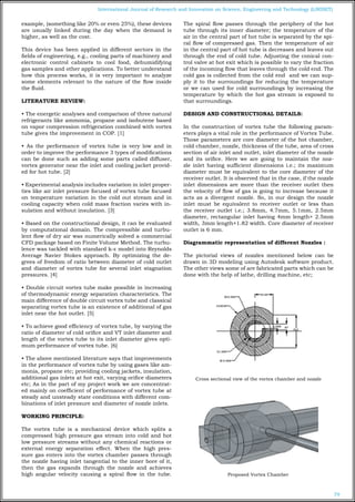 The document discusses the performance testing of vortex tubes in refrigeration, highlighting their advantages over conventional systems that use harmful refrigerants. It explains the working principles, design considerations, and various experimental setups to measure efficiency, including coefficients of performance under different conditions. The study concludes that optimizing the dimensions and flow characteristics of vortex tubes can lead to better energy separation and lower environmental impact.