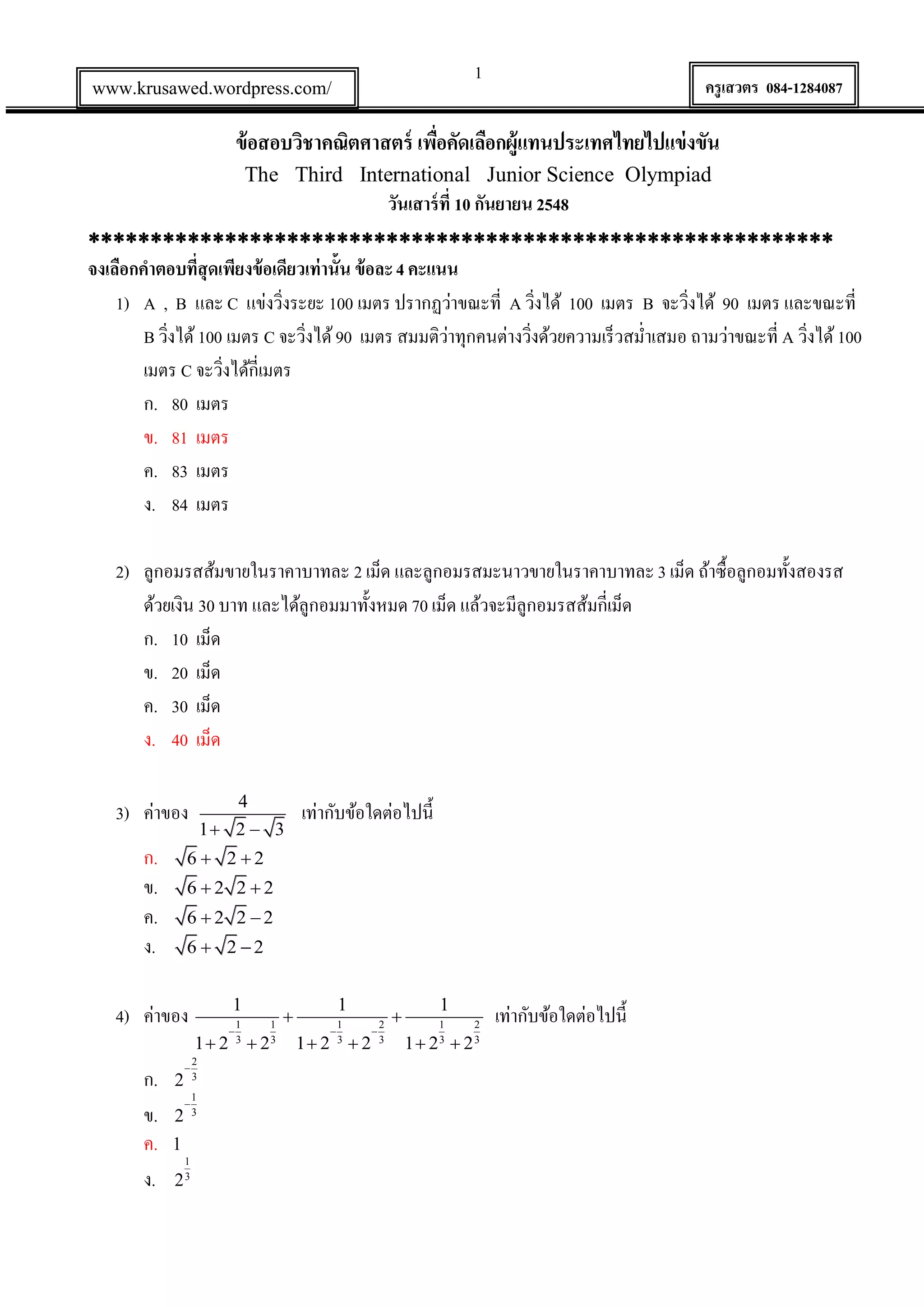 เพือคัดเลือกผู้แทนประเทศไทยไปแข่ งขัน ่ The Third International Junior Science Olympiad วันเสาร์ ที่ 10 กันยายน 2548 จงเลือกคาตอบที่สุดเพียงข้ อเดียวเท่ านั้น ข้ อละ 4 คะแนน 1) A , B และ C แข่งวิงระยะ 100 เมตร ปรากฏว่าขณะที่ A วิงได้ 100 เมตร B จะวิงได้ 90 เมตร และขณะที่ ่ ่ ่ ่ B วิงได้ 100 เมตร C จะวิงได้ 90 เมตร สมมติวาทุกคนต่างวิงด้วยความเร็วสม่าเสมอ ถามว่าขณะที่ A วิงได้ 100 ่ ่ ่ ่ เมตร C จะวิงได้กี่เมตร ่ ก. 80 เมตร ข. 81 เมตร ค. 83 เมตร ง. 84 เมตร 2) ลูกอมรสส้มขายในราคาบาทละ 2 เม็ด และลูกอมรสมะนาวขายในราคาบาทละ 3 เม็ด ถ้าซื้อลูกอมทั้งสองรส ด้วยเงิน 30 บาท และได้ลูกอมมาทั้งหมด 70 เม็ด แล้วจะมีลูกอมรสส้มกี่เม็ด ก. 10 เม็ด ข. 20 เม็ด ค. 30 เม็ด ง. 40 เม็ด 4 1 2 3 3) ค่าของ ก. ข. ค. ง. 6 2 2 6 2 2 2 6 2 2 2 6 2 2 1 4) ค่าของ 1 3 1 2 2 ก. ข. ค. ง. เท่ากับข้อใดต่อไปนี้ 2 2 2 3 1 1 23 1 3 1 3 1 1 3 1 2 2 2 3 1 1 3 1 2 2 2 3 เท่ากับข้อใดต่อไปนี้