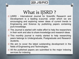 IJSRD is an international, open-access, peer-reviewed journal that publishes papers on engineering science and technology on a monthly basis. It aims to encourage new ideas and share knowledge in these fields. The journal helps researchers, undergraduates, postgraduates, and students publish their work. All published papers are indexed in major services. IJSRD provides benefits such as unlimited free article downloads, online submission and tracking, and free certificates for published articles. It has grown in impact factor and covers over 15,000 published articles by tens of thousands of authors.