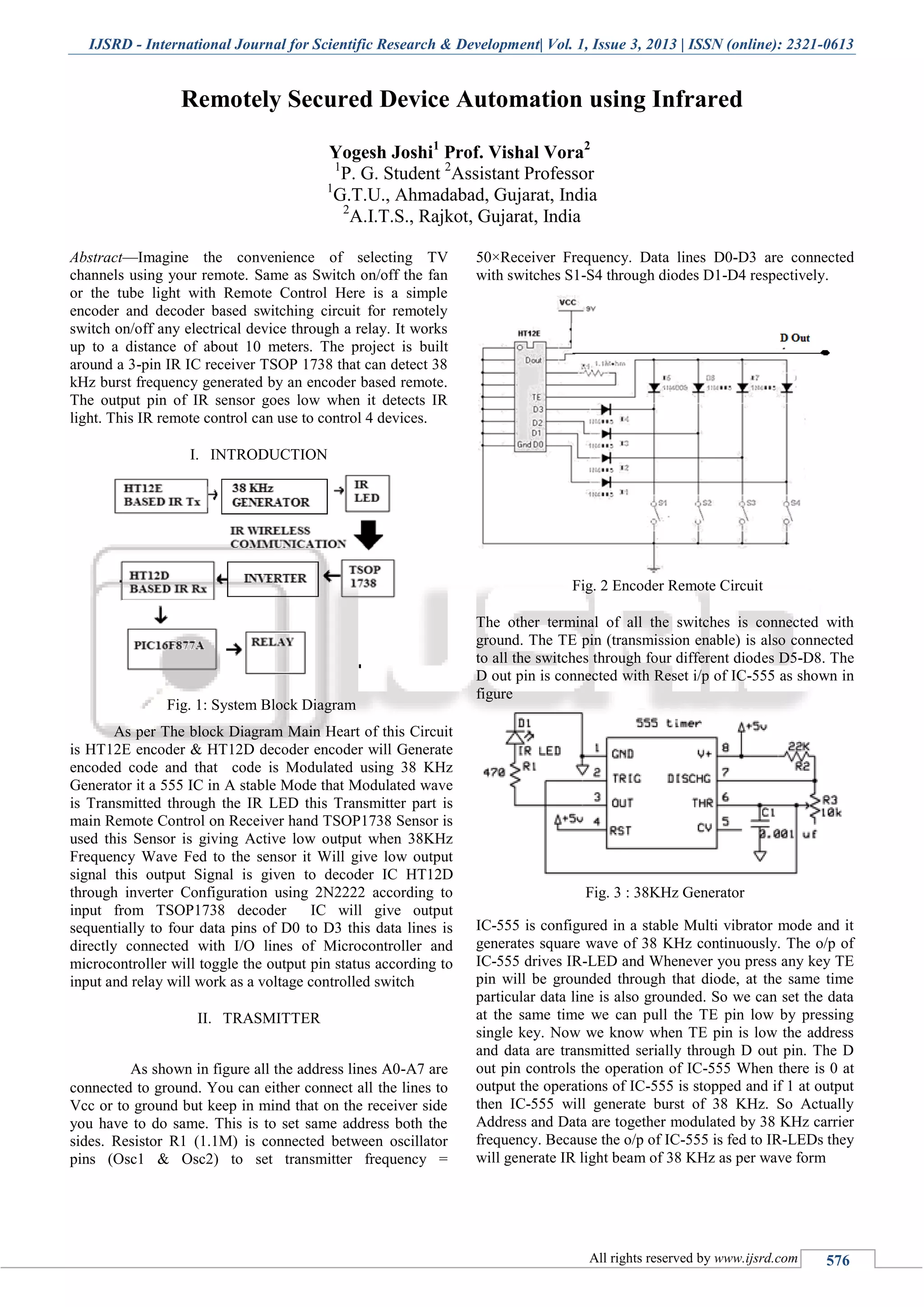 This document describes a remote control system that uses infrared signals to automate and control electrical devices remotely up to 10 meters away. The system uses an HT12E encoder and HT12D decoder, along with a TSOP1738 IR sensor. The encoder generates encoded codes that are modulated with a 38kHz carrier signal from a 555 timer circuit and transmitted via an IR LED. The receiver uses the TSOP1738 sensor to detect the 38kHz IR signals and provides the output to the HT12D decoder. The decoder interprets the address and data signals to control 4 devices by toggling the output pins of a microcontroller. A relay circuit then uses the microcontroller outputs to supply power to the devices being automated.
