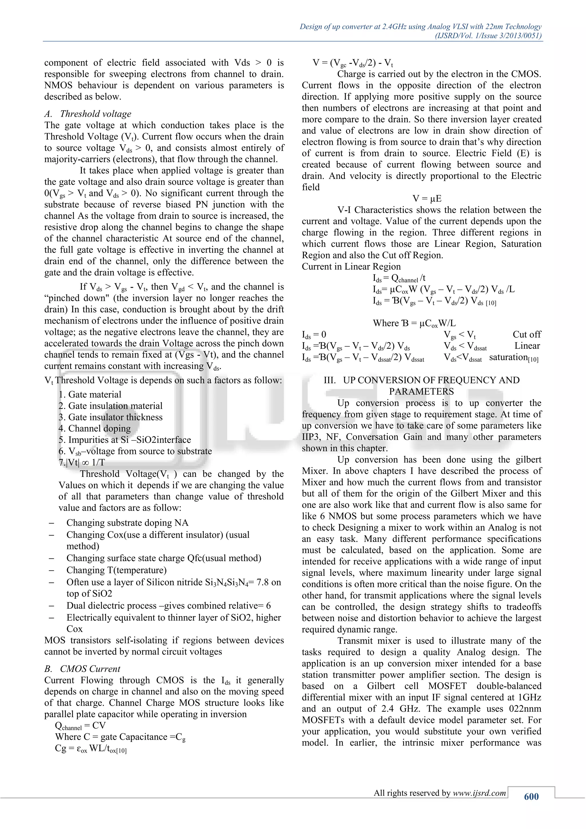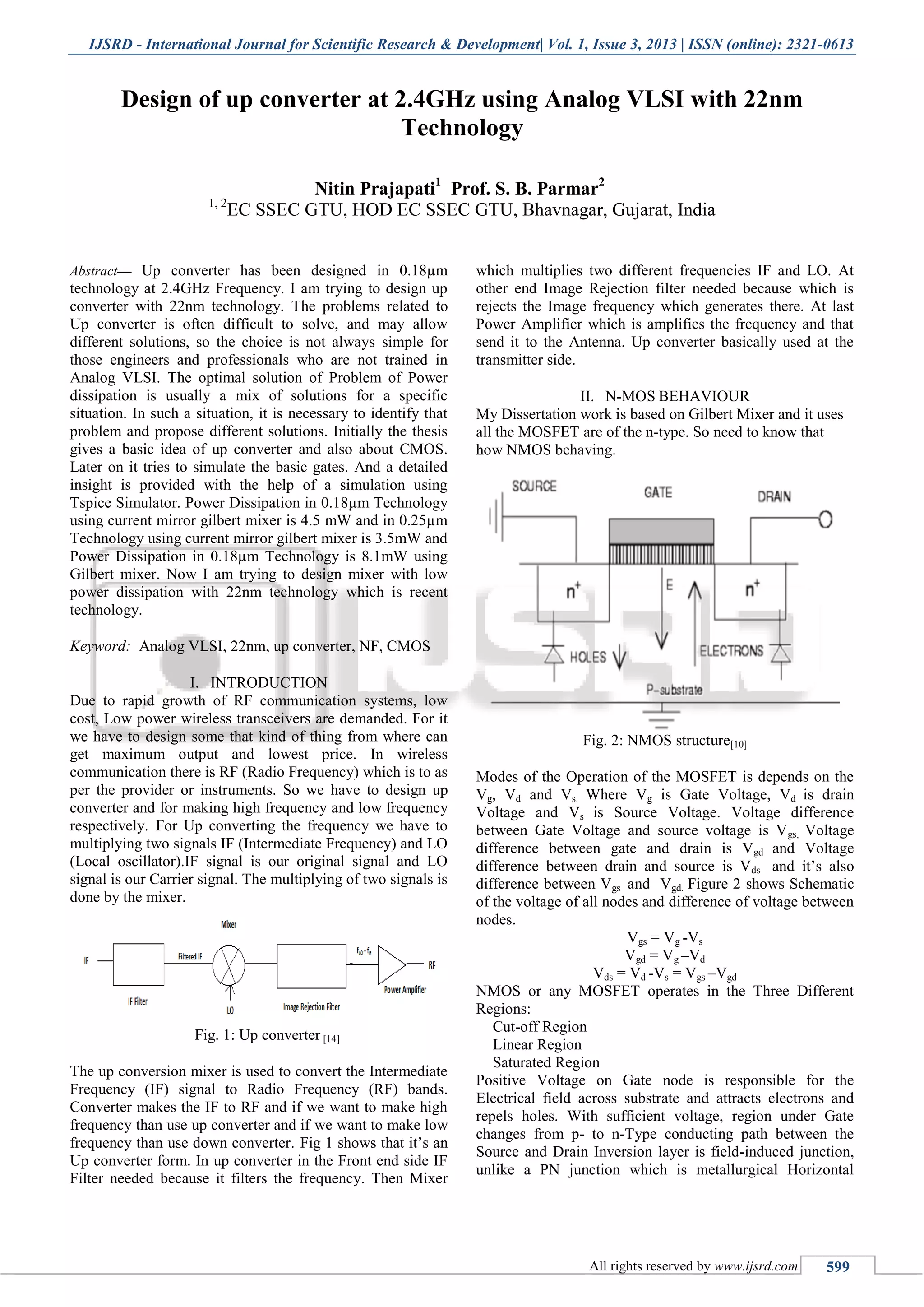 This document describes the design of an up converter at 2.4GHz using Analog VLSI with 22nm technology. It summarizes the design of a previous up converter at 2.4GHz using 0.18um technology. It then discusses the simulation of a Gilbert mixer up converter with different input frequencies and local oscillator signals. Parameters like width to length ratio, input common mode range, noise margin, and power dissipation are also calculated and analyzed. The goal is to design the up converter with low power dissipation using the recent 22nm technology.