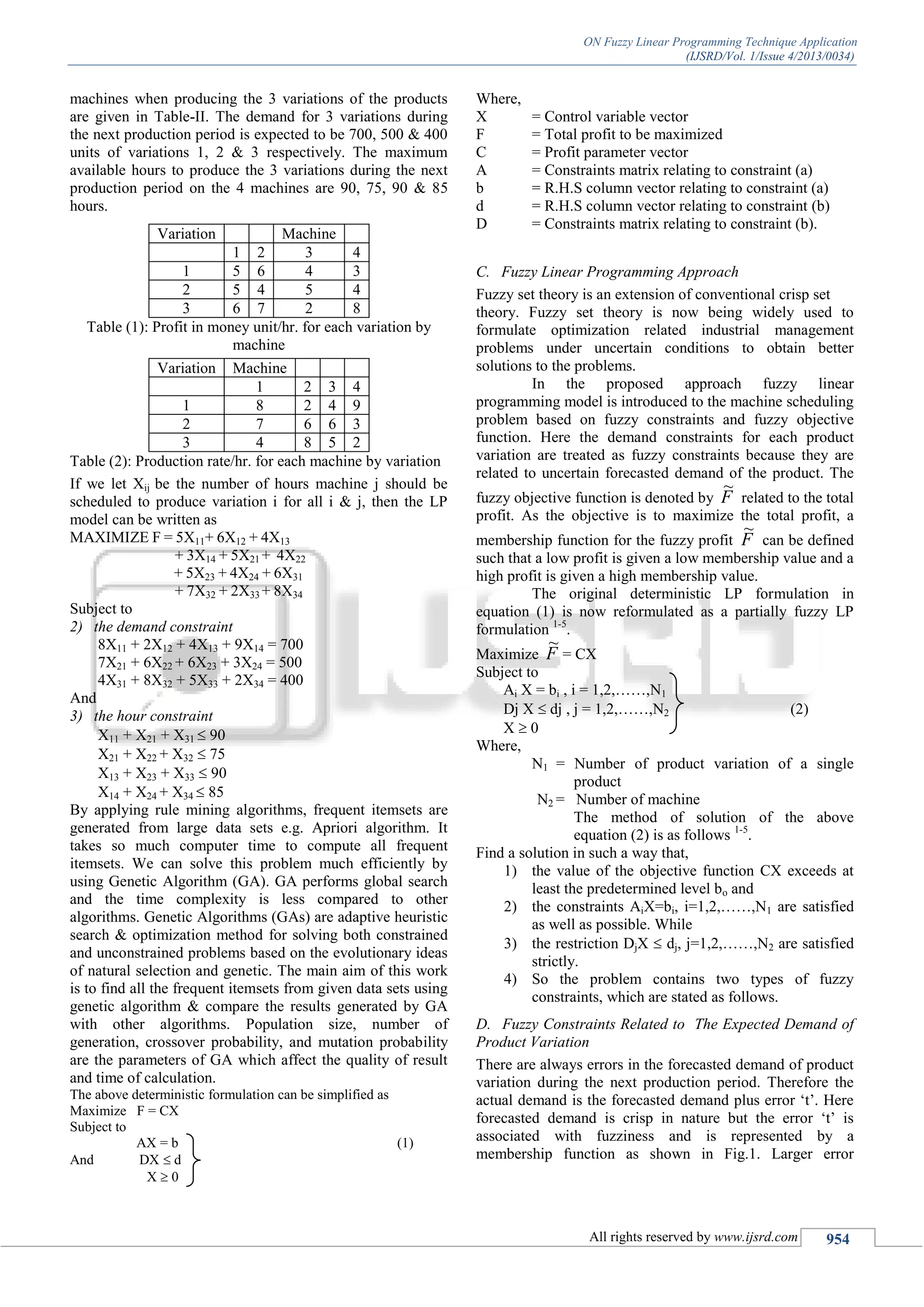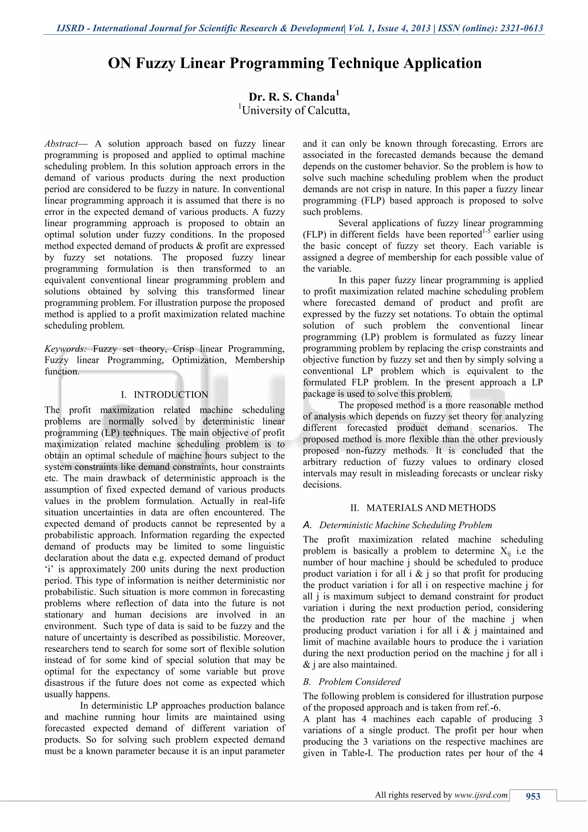The document discusses a fuzzy linear programming (FLP) approach applied to machine scheduling problems, allowing for the uncertain nature of product demand to be factored into the optimization process. It highlights the limitations of conventional deterministic linear programming methods that assume fixed demand values and proposes a transformation of these methods to accommodate fuzzy set notations for both demand and profit. The results indicate that the FLP model offers more flexibility and potentially more accurate scheduling outcomes under conditions of uncertainty.