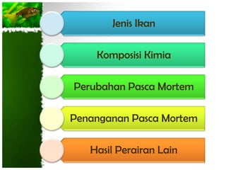 Dokumen ini membahas tentang berbagai jenis ikan, komposisi kimia, dan penanganan pasca mortem ikan dan hasil perairan lainnya. Komposisi kimia ikan dipengaruhi oleh spesies, usia, dan kondisi lingkungan, serta proses perubahan yang terjadi setelah ikan mati seperti rigor mortis. Penanganan pasca mortem dilakukan melalui pendinginan dan pembekuan untuk menjaga kualitas dan cita rasa ikan.
