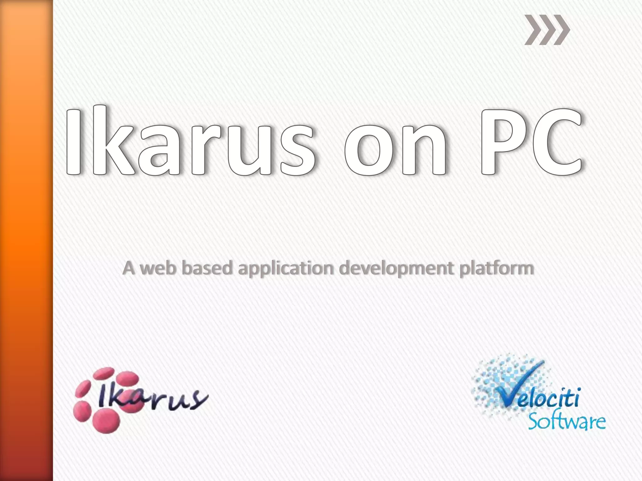 Ikarus on PC is a web-based application development platform that allows for customizable dashboards using CSS3 skins and server push technology with cross-browser support. It features rich flash charts, email integration with services like Exchange and Gmail, a rich text email editor with contact integration, a calendar that integrates with Exchange and other calendars for meetings and reminders, and an XML-based WYSIWYG screen editor for applications that uses asynchronous communication, web services, Spring, and generates screens from domain objects.