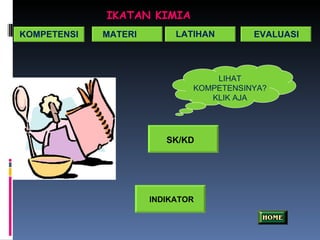 Dokumen ini menjelaskan tentang ikatan kimia, termasuk tipe-tipe ikatan seperti ikatan ion, ikatan kovalen, dan proses pembentukan ikatan tersebut. Materi ini difokuskan pada pemahaman kestabilan atom dan konfigurasi elektron, serta contoh praktis melalui serah terima elektron antar atom. Pembelajaran tersebut diharapkan dapat membantu siswa memahami hubungan antara ikatan kimia dan sifat fisik senyawa yang terbentuk.
