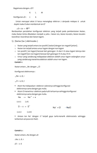 Ikatan kimia terjadi antar atom untuk mencapai kestabilan. Ada empat jenis ikatan, yaitu ikatan ion yang terjadi antara ion positif dan negatif, ikatan kovalen yang berbagi elektron, ikatan koordinasi yang melibatkan logam transisi, dan ikatan logam. Ikatan ion umumnya terbentuk antara logam dan nonlogam seperti Na-Cl, sedangkan ikatan kovalen antara nonlogam seperti O2.