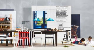 Документ является каталогом товаров IKEA, содержащим информацию о мебели, аксессуарах и ценах на них. Он описывает различные элементы интерьера, идеи для обустройства дома и призывает к экологичному образу жизни, предоставляя советы по экономии ресурсов. Также документация включает интерактивные возможности для пользователей, позволяющие получить дополнительную информацию о товарах через приложение.