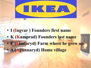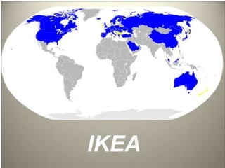 IKEA was founded in 1943 by Ingvar Kamprad in Sweden. It is known for its flat-pack furniture and focus on affordable, functional design. IKEA publishes an annual catalog and has expanded to over 267 stores in 44 countries. Its vision is to offer well-designed home furnishings at low prices so that many people can afford them. IKEA is also committed to environmental sustainability and social responsibility.