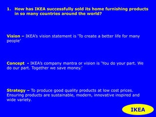 The document discusses IKEA's global success in home furnishings, highlighting its vision to improve lives through affordable, quality products and a strong brand image tied to its Swedish roots. It examines IKEA's marketing strategies, emphasizing the balance between standardized and adapted approaches across different markets, particularly in developed versus developing countries. Moreover, it explores the impact of globalization and technology on cultural similarities and differences, noting that while cultures may converge through shared exposure, distinct subcultures continue to emerge.