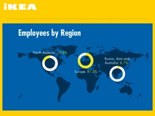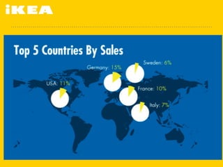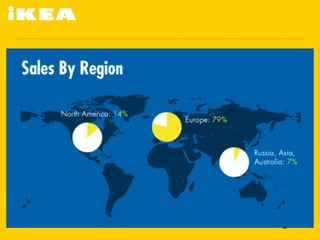 Ikea is an international home products company founded in Sweden in 1926 that designs and sells ready-to-assemble furniture. It has been the world's largest furniture retailer since 2008. Ikea's mission is to create a better everyday life for people. The company cuts costs by locating stores outside cities, using a one-way store format to save energy, and finding the right manufacturers for each product. Ikea has essentially changed how people shop for furniture by offering affordable, ready-to-assemble options, but it must review its strategy to be effective in all global markets.