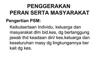 Dokumen tersebut membahas tentang penggerakan peran serta masyarakat dalam bidang kesehatan di Politeknik Kesehatan Kemenkes Yogyakarta. Secara ringkas, dokumen menjelaskan pengertian penggerakan peran serta masyarakat, bentuk-bentuk kegiatannya seperti posyandu dan polindes, serta landasan hukum yang mendukungnya.