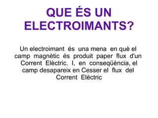 QUE ÉS UNELECTROIMANTS? Un electroimant és una mena en què el camp magnètic és produit paper flux d'un Corrent Elèctric. I, en conseqüència, el camp desapareix en Cesser el flux del Corrent Elèctric