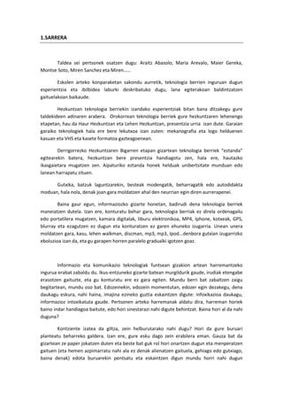 1.SARRERA<br />Taldea seipertsonek osatzen dugu: Araitz Abasolo, Maria Arevalo, Maier Gereka, Montse Soto, Miren Sanchez eta Miren……<br />Eskolen arteko konparaketan sakondu aurretik, teknologia berrien inguruan dugun esperientzia eta ibilbidea laburki deskribatuko dugu, lana egiterakoan baldintzatzen gaituelakoan baikaude.<br />Hezkuntzan teknologia berriekin izandako esperientziak bitan bana ditzakegu gure taldekideen adinaren arabera. Orokorrean teknologia berriek gure hezkuntzaren lehenengo etapetan, hau da Haur Hezkuntzan eta Lehen Hezkuntzan, presentzia urria izan dute. Garaian garaiko teknologiek hala ere bere lekutxoa izan zuten: mekanografia eta logo helduenen kasuan eta VHS eta kasete formatoa gazteagoenean. <br />Derrigorrezko Hezkuntzaren Bigarren etapan gizartean teknologia berriek “eztanda” egitearekin batera, hezkuntzan bere presentzia handiagotu zen, hala ere, hautazko ikasgaietara mugatzen zen. Aipaturiko eztanda honek helduak unibertsitate munduan edo lanean harrapatu zituen. <br />Gutxika, batzuk laguntzarekin, besteak modengatik, beharragatik edo autodidakta moduan, hala nola, denak joan gara moldatzen ahal den neurrian egin diren aurrerapenei. <br />Baina gaur egun, informaziozko gizarte honetan, badirudi dena teknologia berriek maneiatzen dutela. Izan ere, konturatu behar gara, teknologia berriak ez direla ordenagailu edo portatilera mugatzen, kamara digitalak, liburu elektronikoa, MP4, Iphone, kotxeak, GPS, blurray eta ezagutzen ez dugun eta konturatzen ez garen ehuneko izugarria. Unean unera moldatzen gara, kasu, lehen walkman, discman, mp3, mp3, Ipod...denbora gutxian izugarrizko eboluzioa izan da, eta gu garapen horren paralelo gradualki igotzen goaz.<br />Informazio eta komunikazio teknologiak funtsean gizakion artean harremantzeko ingurua erabat zabaldu du. Ikus-entzuneko gizarte batean murgildurik gaude, irudiak etengabe erasotzen gaituzte, eta gu konturatu ere ez gara egiten. Mundu berri bat zabaltzen zaigu begitartean, mundu oso bat. Edozeinekin, edozein momentutan, edozer egin dezakegu, dena daukagu eskura, nahi haina, imajina ezineko guztia eskaintzen digute: infoxikazioa daukagu, informazioz intoxikatuta gaude. Pertsonen arteko harremanak aldatu dira, harreman horiek baino indar handiagoa baitute, edo hori sinestarazi nahi digute behintzat. Baina hori al da nahi duguna?<br />Kontziente izatea da giltza, zein helburutarako nahi dugu? Hori da gure buruari planteatu beharreko galdera. Izan ere, gure esku dago zein erabilera eman. Gauza bat da gizartean ze paper jokatzen duten eta beste bat guk rol hori onartzen dugun eta menperatzen gaituen (eta hemen azpimarratu nahi ala ez denak alienatzen gaituela, gehiago edo gutxiago, baina denak) edota buruarekin pentsatu eta eskaintzen digun mundu horri nahi dugun erabilera ematen diogun, dituen alde ezkutu eta beltzez gain, izugarrizko abantaila suposatzen duelako informazio iturri ase ezin horrek.<br />Izango duen garapena geldiezina izango da eta geroz eta denbora gutxiagoan aurrerapen izugarriak izango ditugu. Hori da gure patua, bizi garen eta datorren gizarte horretan, hezkuntzan IKTak zein bidetan bideratu aukeratzea. Eta eremu honetan badago zenbait kontraesan, finean, bi galdera hauetan laburtzen dena: teknologia berriak erabili behar dira? Eta erabiltzekotan, nola?<br />Lan honen bitartez, hainbat eremu ikusiko ditugu: egungo eskolen errealitatea haur hezkuntzako geletan teknologia berriei dagokionez, ikasgelarekin kontrastean gizarteko errealitatean zer gertatzen ari den eta irakasleak egoera horri zein erantzun ematen dien.<br />Horretarako, gure ingurua nahikoa ezagutzen dugunez, lehen saltoa haur hezkuntzako ikasgeletara joatea izango da, bertako egunerokoa ikusi ahal izateko, darabilten dinamika aztertzeko: ikasleak ematen dioten erabilera eta irakasleak duen papera eta jarrera honen inguruan. Behin eskola desberdinen errealitateak ezagututa, bildutako datuak konparatuko ditugu, berdintasun eta desberdintasunak bilatuz, abantailak zein desabantailak aztertuz, gutxi gora behera, ondorio batzuk ateratzeko (esan beharra dago aterako ditugun konklusioak aztertuko ditugun sei eskoletara mugatuko direla, beraz, hain lagin kopuru txikia izanik, eremu urri horretaz hitz egingo dugula, baieztapenak alde batera utzirik). Behin errealitatea bizitu eta ikusirik, hausnarketara joko dugu, gu baikara etorkizunean geletan egongo garen irakasleak, eta taldekideen ideia desberdinak entzutea eta baloratzea lan aberasgarria dela deritzogu, gure biharko lanean sinetsi eta ahalik eta hoberen egiteko.<br />2.ESKOLEN ARTEKO KONPARAKETA TAULA<br />IGELDOKO ESKOLA TXIKIAZURRIOLA IKASTOLAAMARA BERRILUZAROLANGILEHARDWAREOrdenagailuaBai, bakarra. DVDren bat ikusteko ez bada, arratsaldeetan soilik ematen diote erabilera.5 urteko gelan hasi dira ordenagailuarekin. Etxeetan soberan dauden “patatak” dira. Txantxo, Txirritx eta Xango erabiltze dituzte.Irakasle gelan beste bat dute irakasleen erabilerarako.Bai, 5 urteko gela bakoitzeko ordenagailu bat dute. Ematen dioten erabilpena, jolasteko, informazioa jasotzeko. Lagunen artean mezuak idazteko, eta urtebetetzeko zorion mezuak idazteko.Egunero txandaka, 20 minutuz erabiltzen dute.Bai, 3,4 eta 5 urteko gela bakoitzeko ordenagailu bat dute. Ematen dioten erabilpena, Urtxintxa CDko ekintzak lantzekok, jolasteko, informazioa jasotzeko, eskolako maskotaren egunerokoa egiteko. Egunero, txandaka, 15-20 minutuz erabiltzen da.Bai, 5 urteko gelako ordenagailu bana dute. Ematen dioten erabilpena, jolasteko eta informazioa jasotzeko izaten da.InpresoraBai, haurrek ordenagailuan (Paint edo Txantxo) egindako marrazkiak inprimatzeko erabiltzen da.Bai, irakasle gelan dago.Bai, irakasle gelan dago. Egindako mezuak eta lan orokorrak inprimatzen dituzte.Bai, irakasle gelan dituzte bi, bat hp zahar bat, eta Epson itxurako bat. Zaharra erabiltzen dute egunerokoa astean behin inprimatzeko, eta bestea, haurrek egindako marrazkiak eta jasotako informazioa inprimatzeko.Haur Hezkuntzarako inpresora
