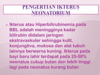 Ikterus neonatorium adalah peningkatan kadar bilirubin pada bayi baru lahir yang dapat bersifat fisiologis atau patologis. Faktor penyebabnya meliputi prahepatik, pascahepatik, dan hepatoseluler dengan gejala yang muncul pada hari kedua atau ketiga setelah lahir. Penanganan mencakup asupan makanan bergizi bagi ibu dan rujukan ke puskesmas jika terjadi ikterus parah.