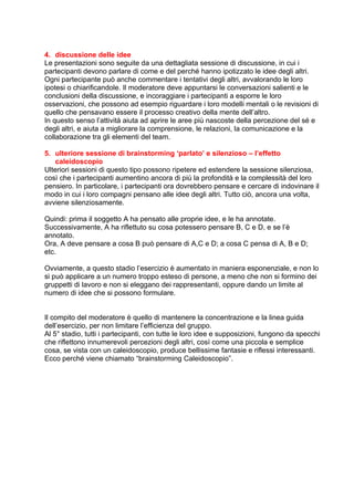 Il brainstorming caleidoscopio è una tecnica innovativa di problem-solving e team-building che aumenta significativamente la quantità e la qualità delle idee generate. Prevede una fase di silenzio in cui i partecipanti riflettono e scrivono le idee, seguita dalla presentazione e discussione di queste, promuovendo empatia e comprensione tra i membri del team. Questa metodologia è applicabile a vari contesti e migliora le relazioni e la collaborazione tra i partecipanti.