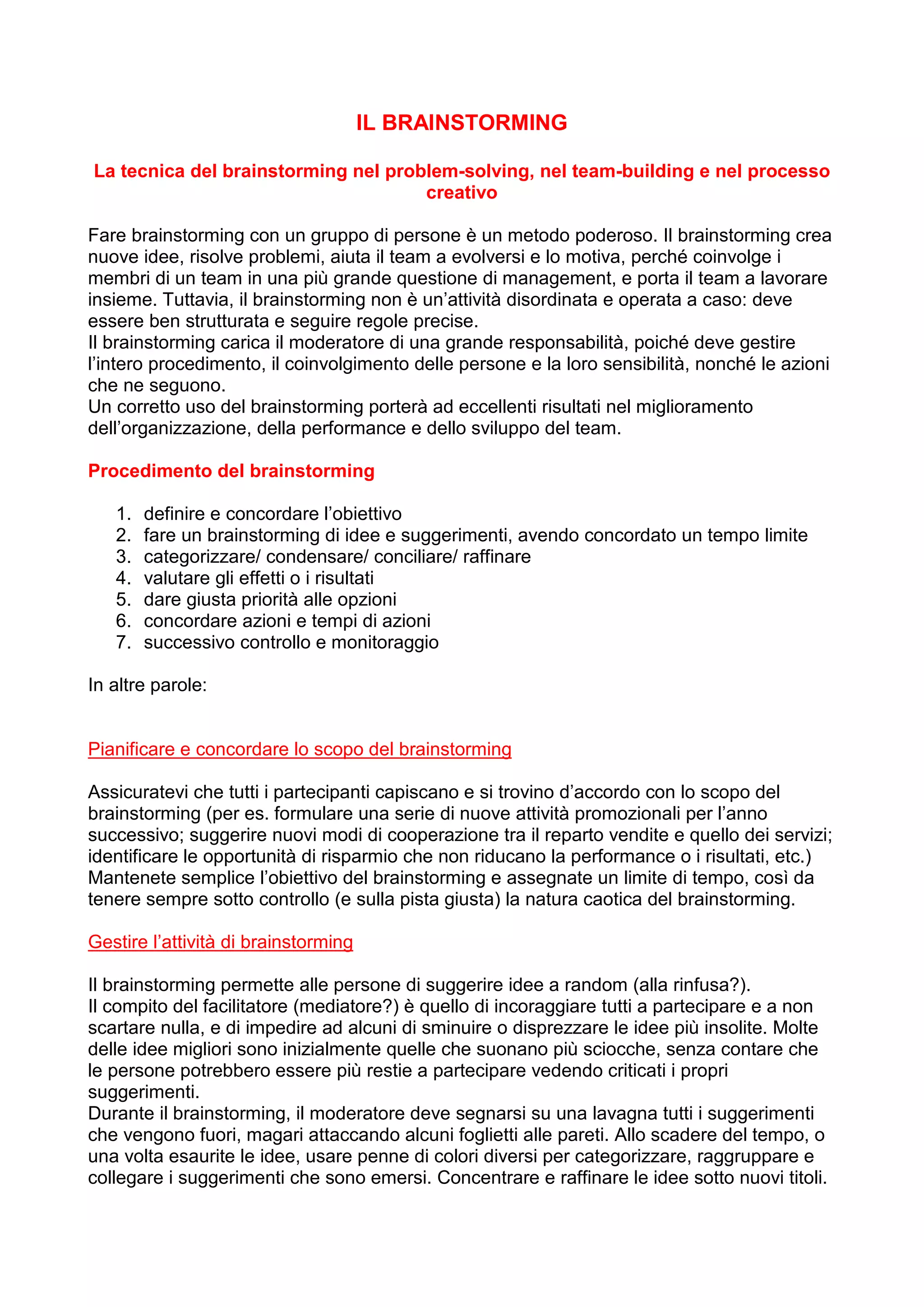 Il brainstorming è una tecnica efficace per generare idee, risolvere problemi e migliorare il team-building, richiedendo una struttura e regole precise. Il moderatore ha il compito di facilitare la partecipazione e gestire le idee, evitando giudizi prematuri e creando un ambiente di supporto. Un uso appropriato del brainstorming porta a risultati significativi, stimolando l'organizzazione e la motivazione del team.
