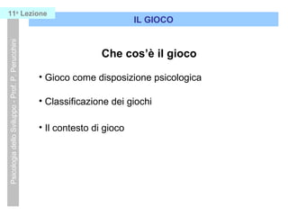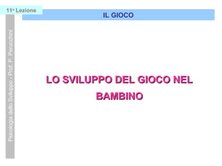 Il documento esplora l'importanza del gioco nello sviluppo infantile, evidenziando che il gioco permette ai bambini di sviluppare competenze cognitive e socioaffettive attraverso varie forme, tra cui gioco di esercizio, simbolico e di regole. Viene discutita l'evoluzione del gioco secondo Piaget, delineando le fasi di sviluppo dal gioco di esercizio al gioco simbolico e alle regole, e l'importanza della socializzazione nel gioco. Inoltre, si considerano i fattori che influiscono sulla competenza del gioco, come età, interazione sociale e ambiente.