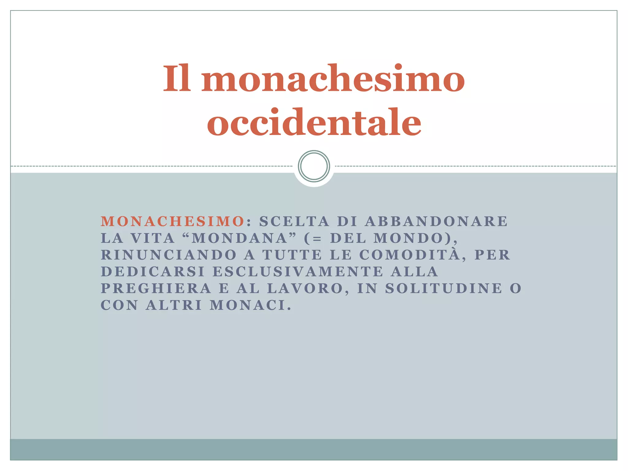 Il documento descrive le origini e le pratiche del monachesimo, in particolare quello occidentale, che nasce nel III secolo con l'allontanamento dai centri abitati per una vita di preghiera e lavoro. San Benedetto fonda nel IV secolo il monastero di Montecassino, stabilendo regole per la comunità monastica, tra cui 'ora et labora'. Viene evidenziata l'importanza del lavoro manuale e intellettuale, nonché la produzione di manoscritti come testimonianza dell'arte medievale.