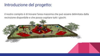 Il progetto del parco giochi 'Sunshine' si concentra sulla massimizzazione dell'area recintata in cui ospitare vari giochi per bambini. Sono state ridotte in scala le dimensioni dei giochi e dell'area del parco per garantire che ogni gioco possa essere posizionato correttamente. Il parco ha una misura totale di 23x26 metri e sono stati calcolati gli spazi necessari per ogni attrezzatura ludica.