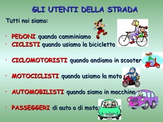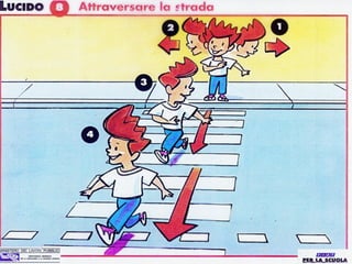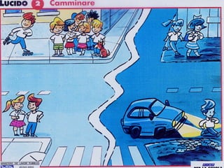 Il documento tratta l'importanza della sicurezza stradale per i pedoni, evidenziando che tutti siamo utenti della strada con specifici doveri. Sottolinea le difficoltà di percezione e reazione nei bambini e negli anziani, e fornisce raccomandazioni pratiche su come comportarsi correttamente per ridurre i rischi di incidenti. Infine, illustra le regole fondamentali e i comportamenti sicuri da adottare per una corretta convivenza con il traffico veicolare.