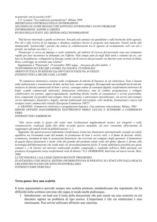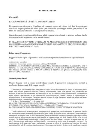 Il saggio breve è un testo argomentativo che fornisce spunti su temi attuali e storici, richiedendo una buona preparazione culturale. Il documento esplora l'importanza delle nuove tecnologie nell'economia e nella comunicazione, evidenziando opportunità e sfide nel mondo del lavoro e del commercio elettronico. Infine, propone una struttura standardizzata per l'elaborazione di un saggio, enfatizzando la chiarezza e la comprensibilità nell'esposizione.