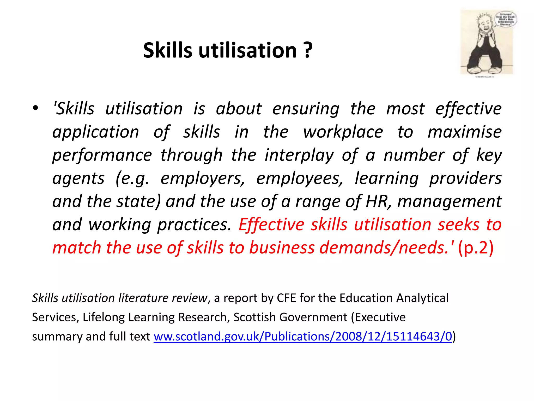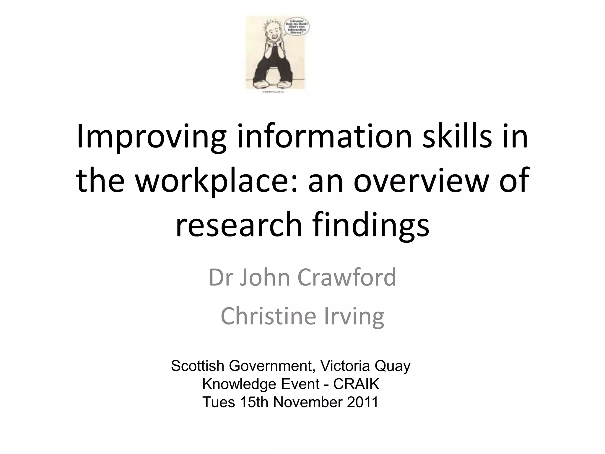 This document summarizes research on information skills and literacy in the workplace. It finds that while the term "information literacy" is not widely used in workplace settings, the skills it encompasses around finding, evaluating, and using information are important. However, formal training on these skills is rarely provided in the workplace. The document also outlines several studies conducted by the authors, which found that information sharing and learning in the workplace is often informal and social. Conclusions from the research emphasize the importance of interpersonal relationships in developing information skills on the job.