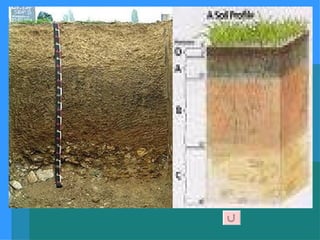Il suolo, o pedosfera, è lo strato superficiale della crosta terrestre formato dall'erosione delle rocce attraverso agenti atmosferici. Esso è composto da frazioni organiche e inorganiche, inclusi humus, sabbia, limo e argilla, e si suddivide in diversi strati, o orizzonti, ognuno con composizioni diverse. Gli orizzonti variano dall'orizzonte A, ricco di humus, fino all'orizzonte D, costituito da roccia madre.