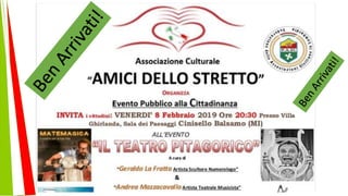 L'associazione culturale "Amici dello Stretto" promuove eventi e attività volte a migliorare la vita dei cittadini attraverso dibattiti, conferenze e iniziative di solidarietà. Fondata da un gruppo di persone con l'obiettivo di fornire servizi educativi e culturali, si ispira a valori di uguaglianza sociale e inclusione. Il documento descrive la programmazione di eventi futuri e l'importanza di fare rete tra la comunità siciliana e calabrese.
