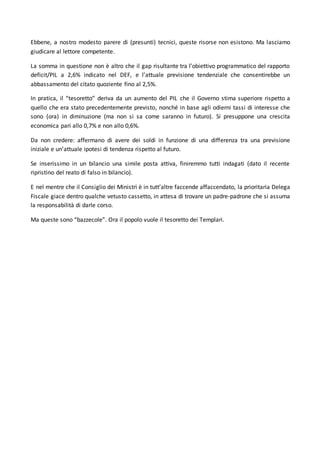 Il documento discute la questione del 'tesoretto' di 1,6 miliardi annunciato dal governo, mettendo in dubbio la sua reale esistenza e confrontandolo con leggende come quella dei Templari. Si critica l'uso del termine 'tesoretto' come riduttivo e si sottolinea il contesto di emergenze economiche, evidenziando la possibilità di un aumento della pressione fiscale. Infine, si sostiene che il tesoretto derivi da stime ottimistiche di crescita economica e dalla differenza tra obiettivi di deficit, suggerendo una mancanza di fondamento reale per queste risorse.