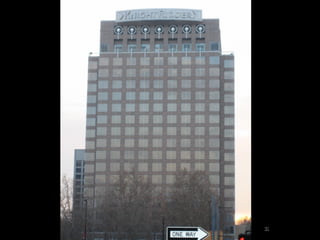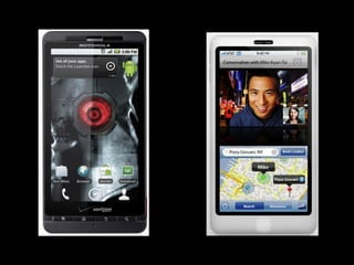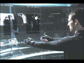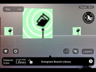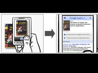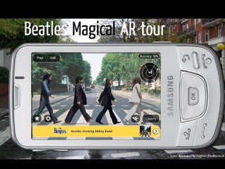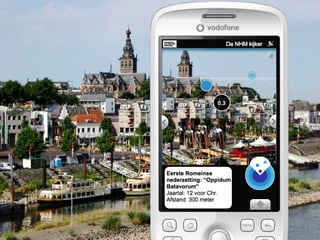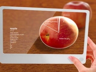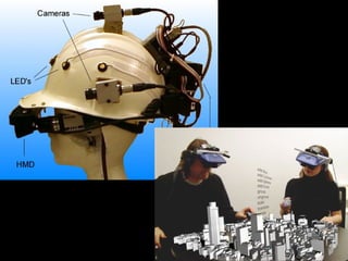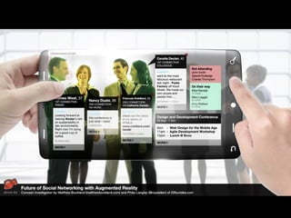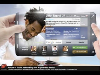 Augmented reality uses technologies like GPS, cameras, and accelerometers to overlay digital objects and information on top of the real world. Examples of augmented reality applications include QR code readers, visual search apps, and location-based experiences created with platforms like Layar and Wikitude. Libraries are exploring uses of augmented reality, such as local history walking tours created by the San Jose Public Library using the Layar platform. Development of augmented reality brings up societal issues around connectivity, privacy, and the balance between an increasingly digital world and real-world isolation.