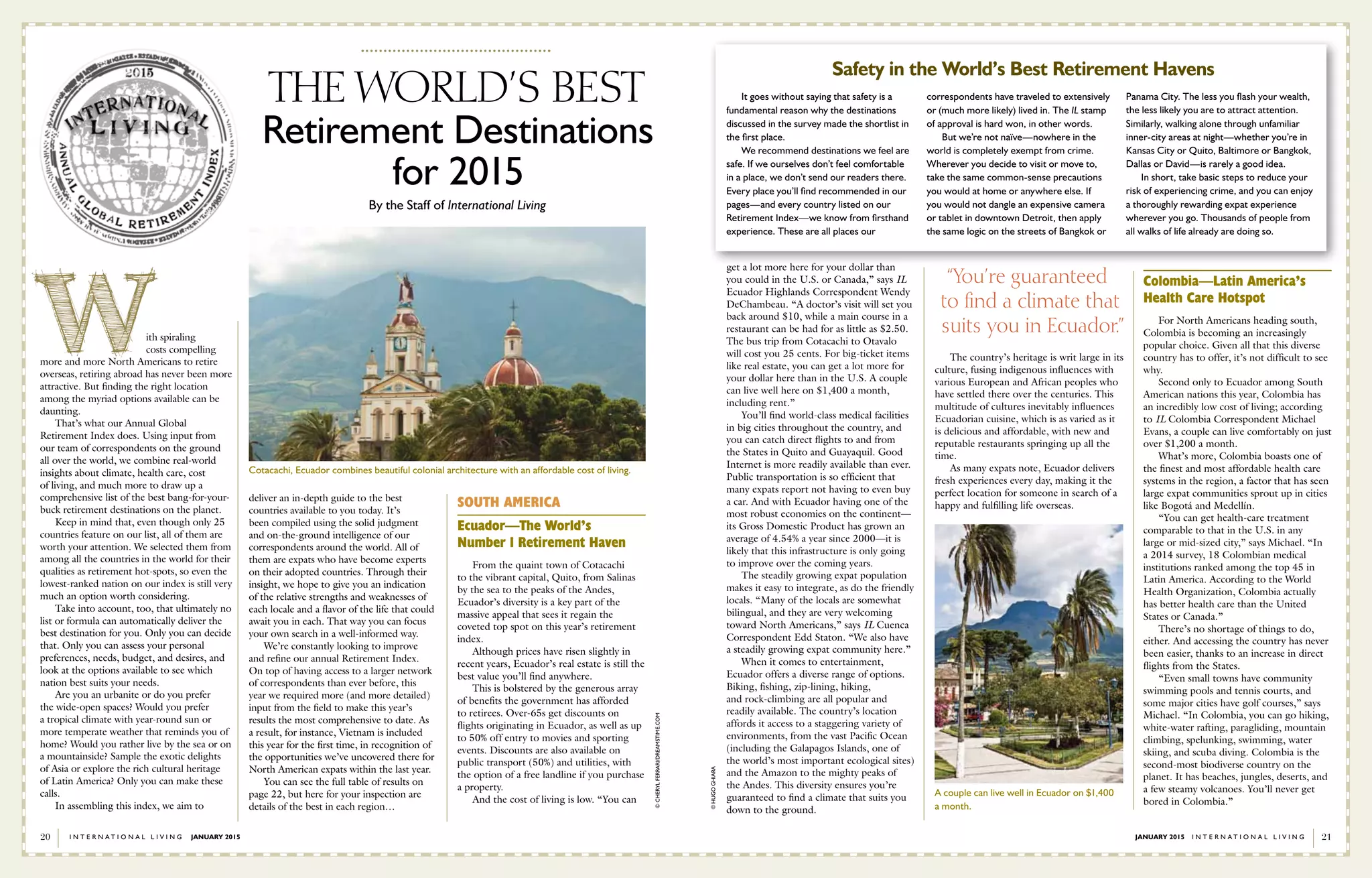 The document summarizes an annual report by International Living that ranks the best countries for retirement. It discusses the methodology used to compile the ranking, which considers factors like cost of living, healthcare quality, expat communities, amenities, infrastructure, and special benefits for retirees in different countries. The top countries highlighted include Ecuador, which takes the number one spot due to its low costs, good climate and amenities. Panama ranks highly and offers retirees significant discounts on expenses through special visa programs.