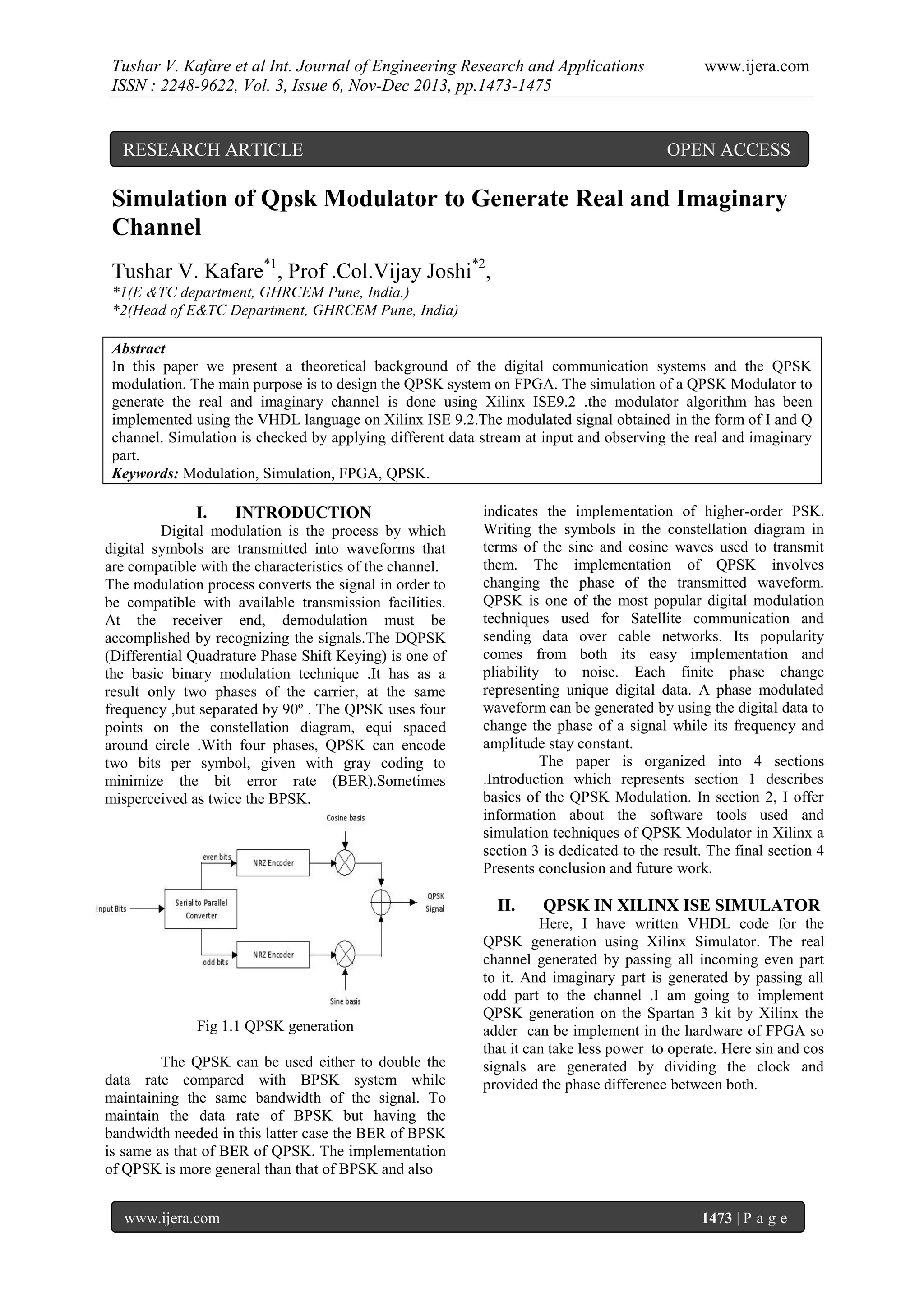 The document presents research on the simulation of a QPSK modulator using FPGA, detailing the theoretical framework of digital communication systems and QPSK modulation. It describes the implementation of the modulator algorithm in VHDL on Xilinx ISE 9.2 and discusses the results of various input data streams for real and imaginary channel generation. The conclusion emphasizes the system’s potential to enhance data rates while minimizing power requirements through FPGA technology.