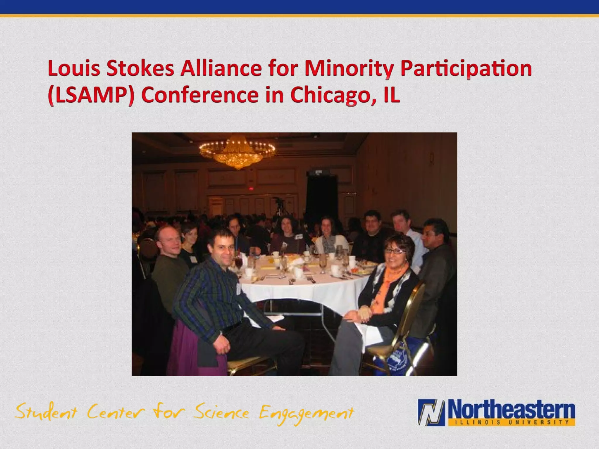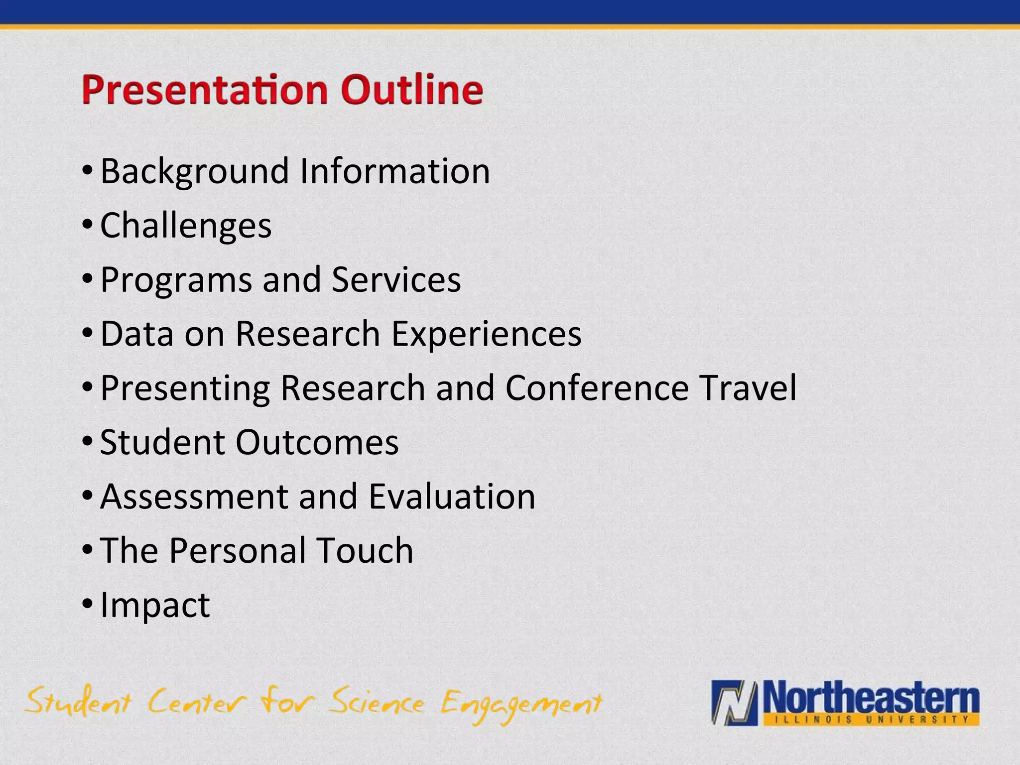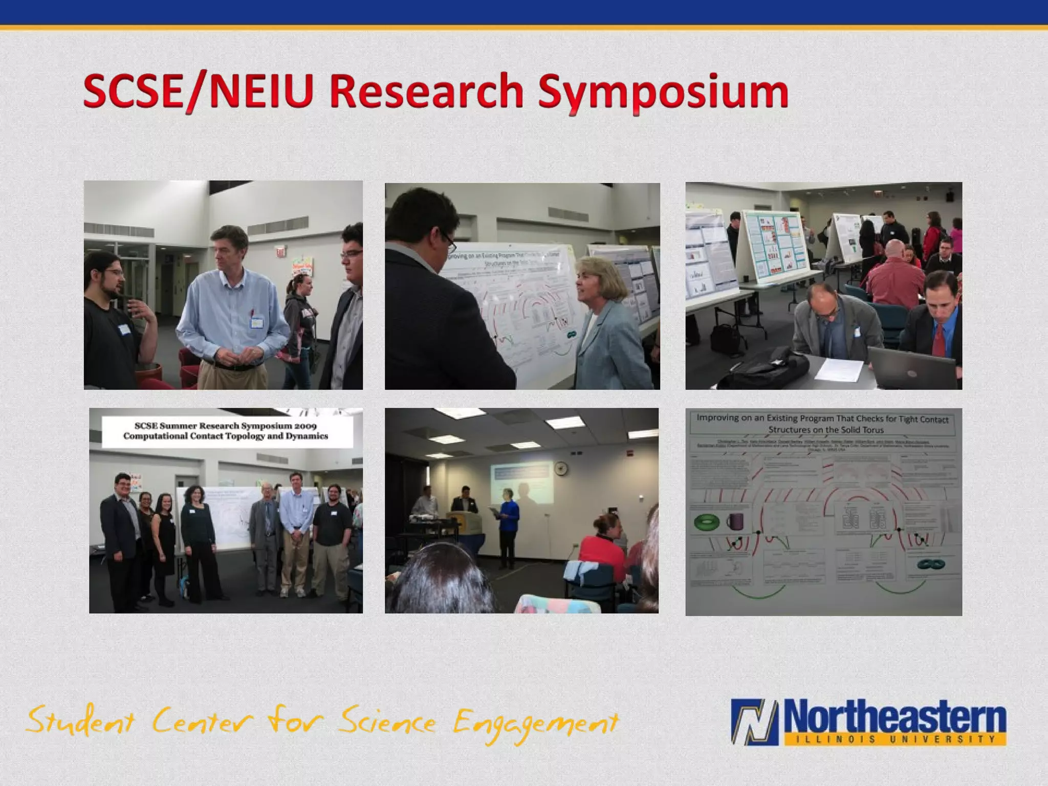 The document describes the Science and Computing Center for Excellence (SCSE) at Northeastern Illinois University. The SCSE aims to recruit and support underrepresented and first-generation students pursuing STEM degrees. It provides various academic and professional programs including tutoring, research experiences, conference travel, graduate school preparation, internships and career guidance. Assessment data shows the SCSE has increased STEM enrollment and graduation rates, particularly among Hispanic and low-income students. The personalized support from the SCSE staff has helped many students succeed in STEM fields.