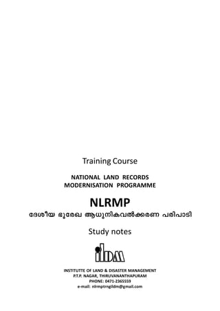 The document serves as study material for a training course on the National Land Records Modernisation Programme (NLRMP) offered by the Institute of Land and Disaster Management. It outlines various aspects of land management assessment techniques, methodologies, and critical components essential for understanding the NLRMP. Additionally, it includes contact information for the institute and emphasizes the importance of land records in effective disaster management.