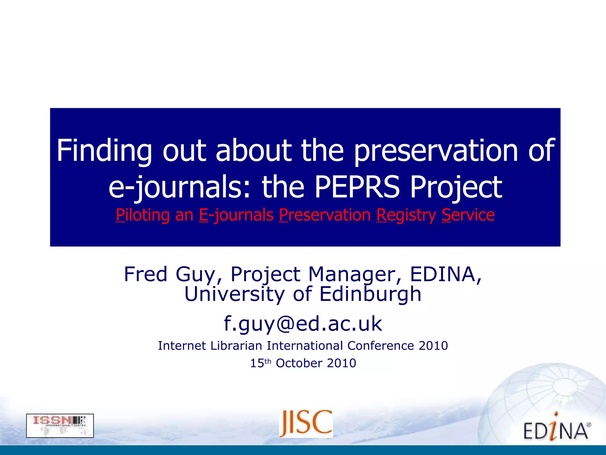 - The PEPRS project aims to create a registry of digital preservation activities for e-journals to help libraries and policymakers understand what content is being archived.