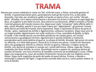 Il documento narra le nozze tra Teti e Peleo, eventi che portano all'assegnazione del pomo della discordia a Paride, il quale sceglie Afrodite, scatenando la guerra di Troia. La storia si concentra sull'ira di Achille, che si ritira dal conflitto dopo aver perso la sua schiava Briseide e che vendica la morte del suo amico Patroclo uccidendo Ettore. Viene anche discusso il dibattito sulla paternità e l'attendibilità dell'Iliade e dell'Odissea, nonché il carattere e il destino dei principali protagonisti.