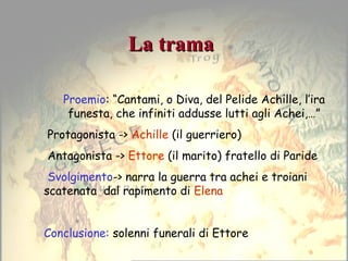 L'Iliade narra la guerra tra Achei e Troiani, scatenata dal rapimento di Elena, con Achille come protagonista e Ettore come antagonista. Il documento descrive anche il contesto mitologico, inclusi il matrimonio di Peleo e Teti e le divinità coinvolte nel conflitto. Inoltre, si accenna all'esistenza storica di Troia e alle scoperte archeologiche di Schliemann.