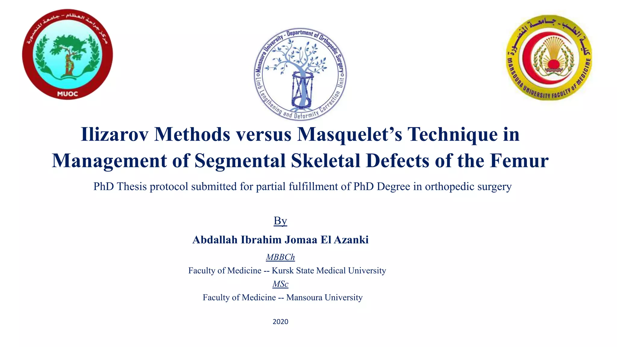 This PhD thesis protocol compares the Ilizarov method and Masquelet’s technique in managing segmental skeletal defects (SSD) of the femur, addressing a significant challenge in orthopedic surgery. It outlines the study's aim, objectives, patient selection criteria, and investigative methods, including imaging and evaluation of postoperative outcomes. The study seeks to evaluate bone healing, functional results, and patient satisfaction while adhering to ethical considerations.