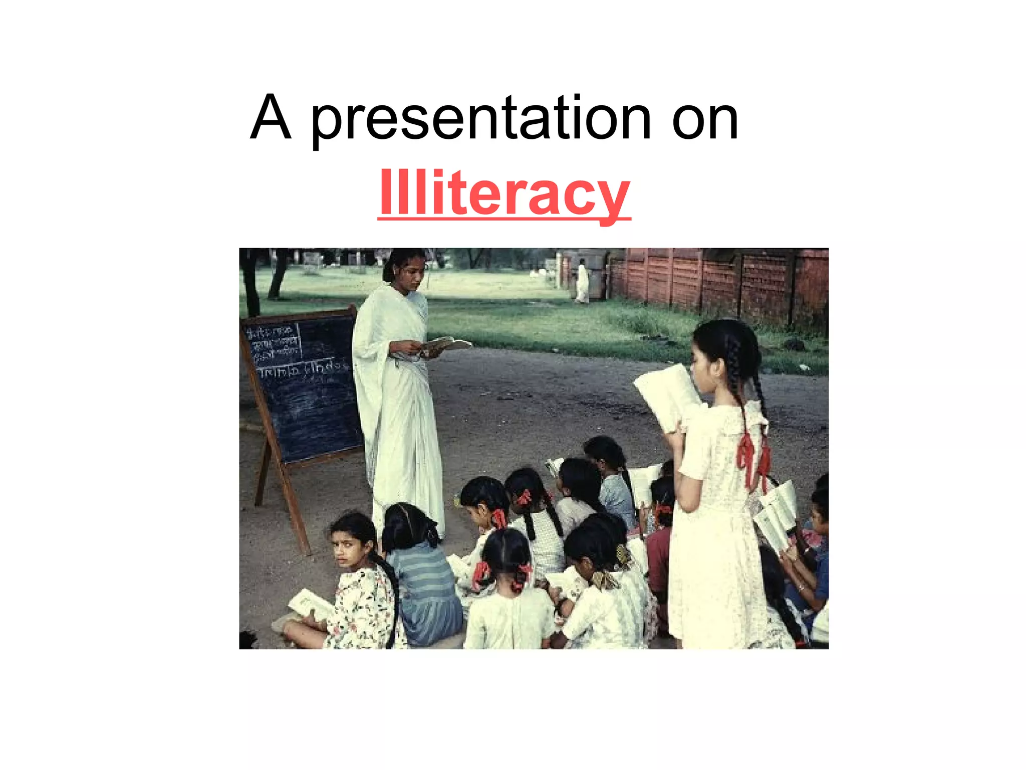 The document presents information on illiteracy, including its causes such as poverty and lack of access to education, its impacts such as inhibiting country development, and proposed solutions to address it such as ensuring equal access to education and eradicating illiteracy among women. Statistics are provided showing over 27% of people globally are illiterate and that two-thirds of the world's illiterate population are women.