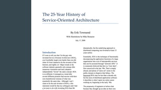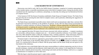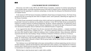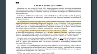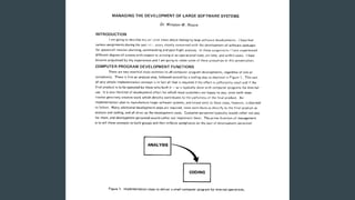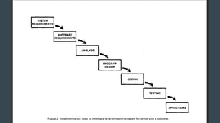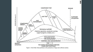 The document discusses the history of software engineering and early ideas in the field. It notes that the term "software engineering" was coined in 1968 to imply a more rigorous, engineering-based approach was needed for software development. Early conferences discussed ideas like integrating testing into design instead of after, and that small teams tend to be more successful than large ones. The document also examines some of the challenges faced and lessons learned over decades of software development.
