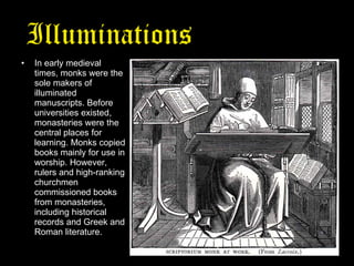 - Monks in medieval times were the sole creators of illuminated manuscripts and copied books mainly for religious use in monasteries.