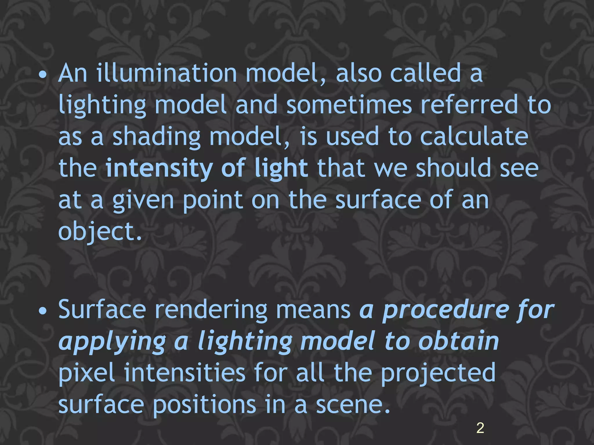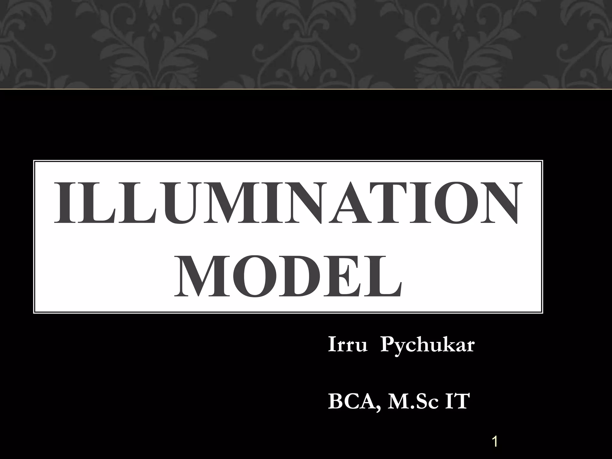 The document discusses illumination models used to calculate light intensity on object surfaces in 3D scenes. It describes how surface rendering uses illumination models to determine pixel intensities. Diffuse and specular reflection are explained along with parameters like ambient light, material properties, number of light sources, attenuation, and shadows. Color considerations and transparent surfaces are also covered at a high level.