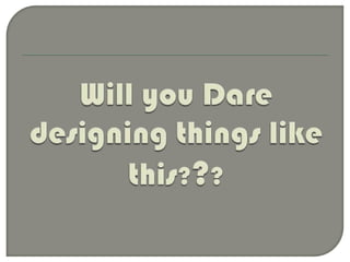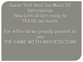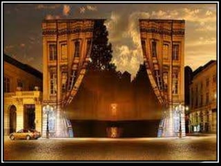 Optical illusions occur when the brain perceives images differently than physical reality. They are created by excessive stimulation of the eyes that results in unconscious inferences by the brain. Architectural illusions are a type of optical illusion where the design of buildings causes the perception of images to differ from the actual physical structures.