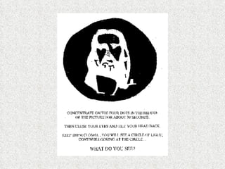 The document presents 14 optical illusions and asks the reader to describe what they see in each illusion. Some illusions involve ambiguous images that can be interpreted in multiple ways, such as a duck or rabbit or young woman or old lady. Other illusions play tricks with perception by making straight lines or parallel diagonals appear bent. The illusions demonstrate how visual perception can be deceived despite what is objectively present.