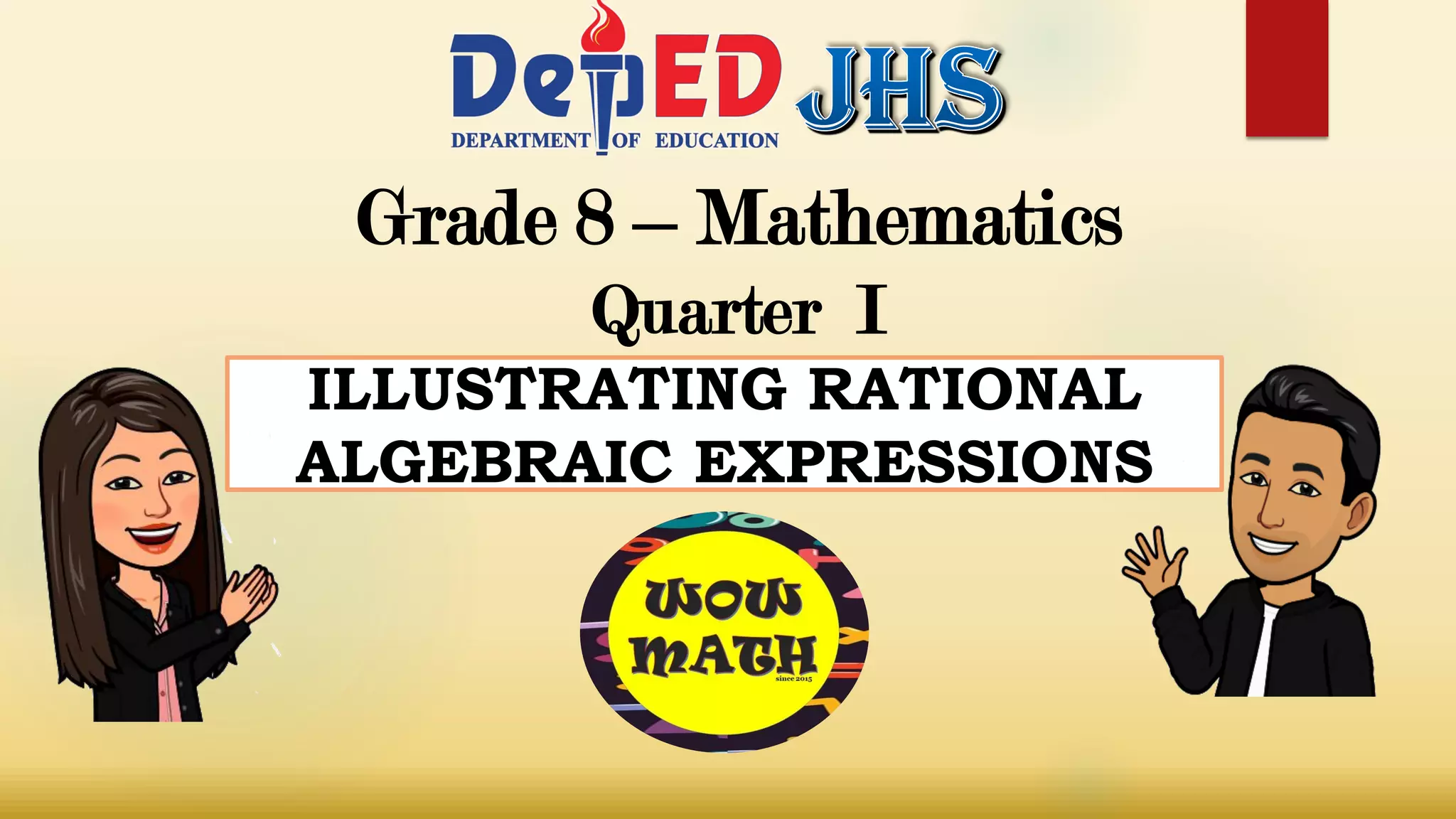This document focuses on grade 8 mathematics, specifically addressing the illustration, evaluation, and conditions under which rational algebraic expressions become undefined. It provides definitions and examples of evaluating expressions and explains how to determine values that make expressions undefined by equating the denominator to zero. Additionally, it includes practice problems for students to test their understanding of these concepts.