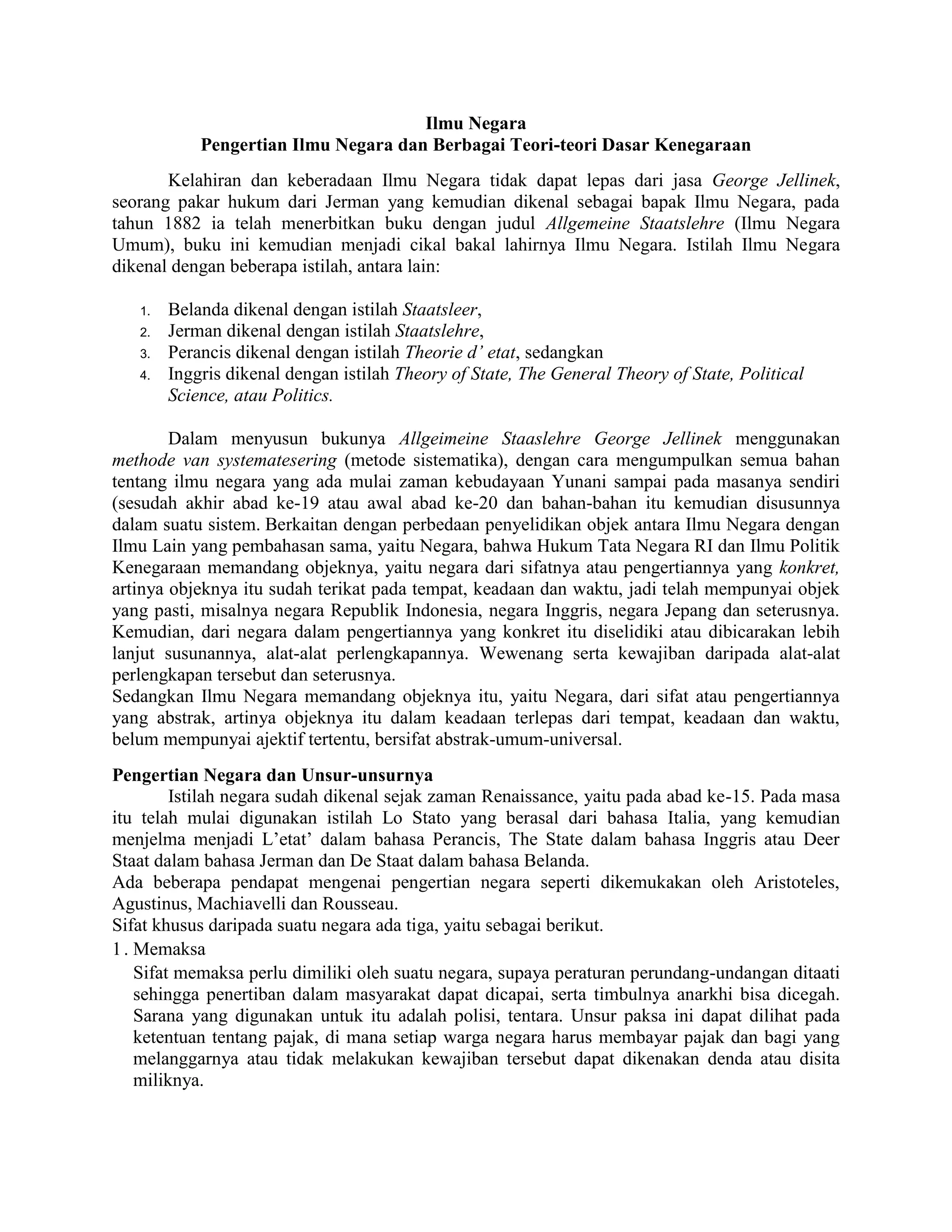 Dokumen ini membahas pengertian dan perkembangan ilmu negara, termasuk kontribusi George Jellinek sebagai bapak ilmu negara, yang memperkenalkan berbagai teori mengenai negara dan fungsi serta struktur dasarnya. Terdapat penjelasan mengenai unsur-unsur negara, teori tujuan dan asal mula negara, serta pemikiran para filsuf klasik seperti Aristoteles dan Plato terkait organisasi negara. Selain itu, dokumen ini menguraikan peran dan teori kedaulatan dalam konteks negara modern.